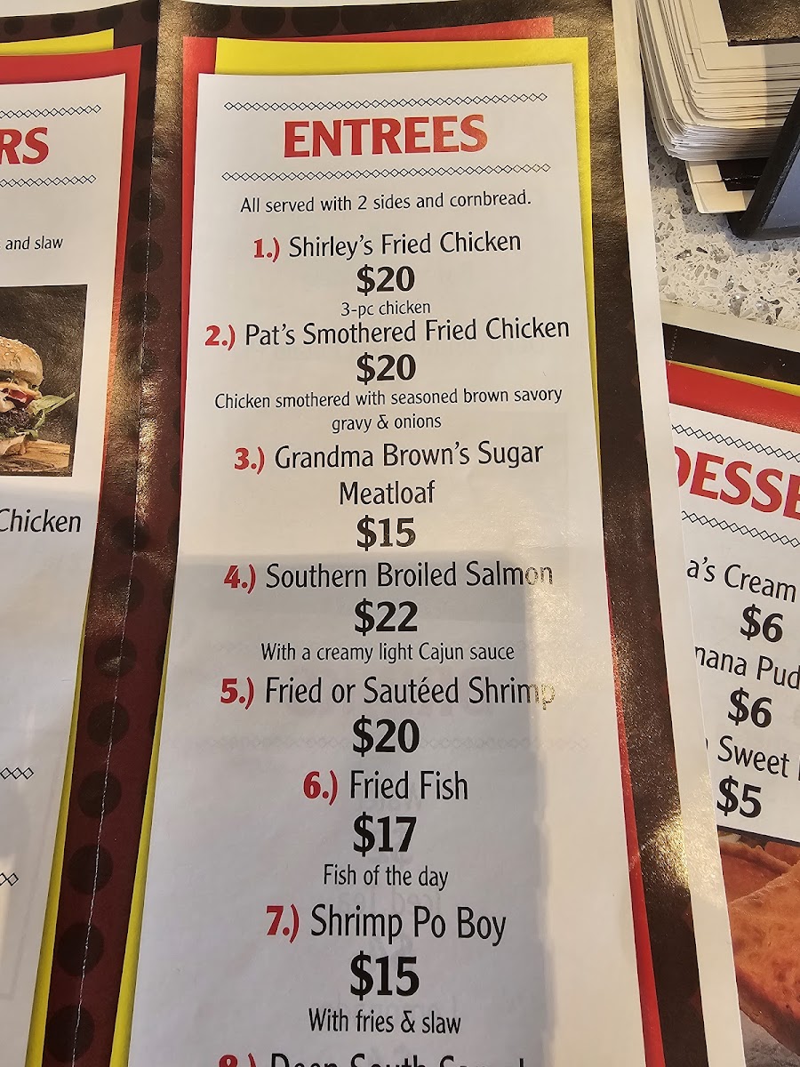 Introducing the menu: The culinary offerings at Shirley's feature hearty appetizers, including crispy fried wings and fluffy hush puppies, perfect for igniting your appetite. For mains, dive into Shirley's Fried Chicken, smothered in savory gravy, or indulge in Southern Broiled Salmon with a rich Cajun sauce. Don’t forget the Banana Pudding or Sweet Potato Pie for a sweet finish that will evoke memories of home-cooked meals.